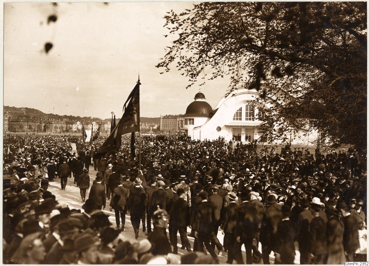 Arbetarnas demonstrationståg 1921. Inmarsch till Heden från korsningen Gamla Allén/Parkgatan.