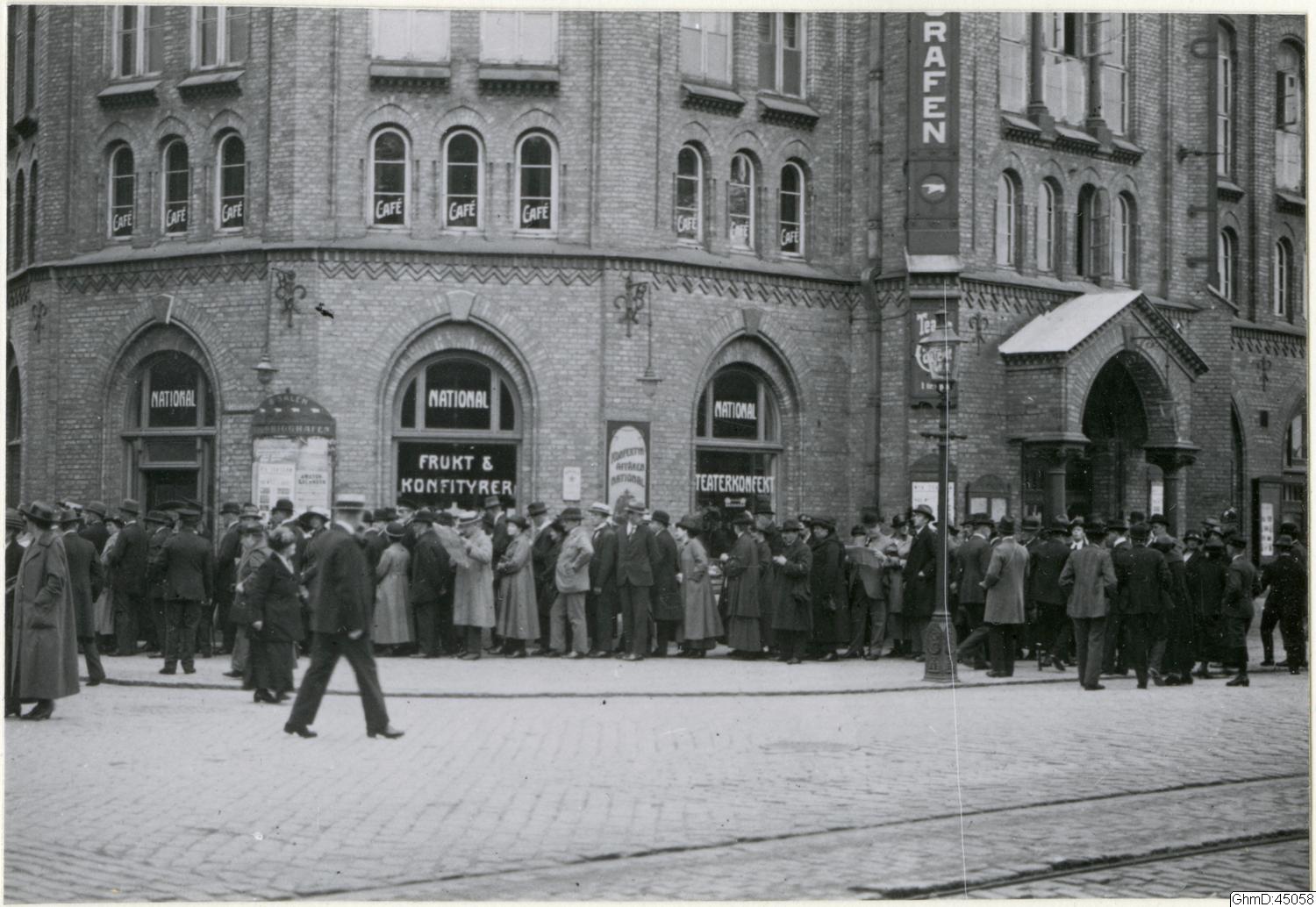 Beskrivning: Kö vid folkomröstningen om förbud mot rusdrycksförsäljning 27 augusti 1922 till vallokalen i Arbetarinstitutets hus på Järntorget