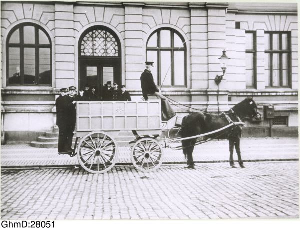 Postleverans med häst och vagn utanför gamla Posthuset. Bakom vagnen syns ytterligare medarbetare vid Posten.