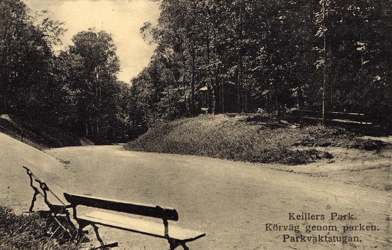 Beskrivning: Keillers Park, körväg genom parken och parkvaktstugan.