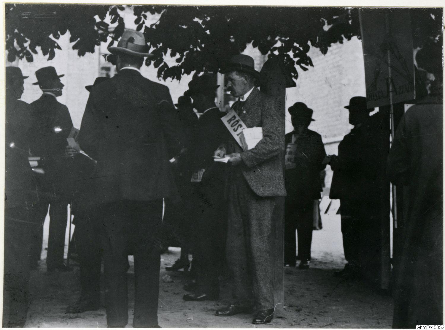 Vid folkomröstningen om förbud mot rusdrycksförsäljning 27 augusti 1922. Röstande och valarbetare utanför vallokal i Olivedal. En av valarbetarna har en vit banderoll över bröstet.