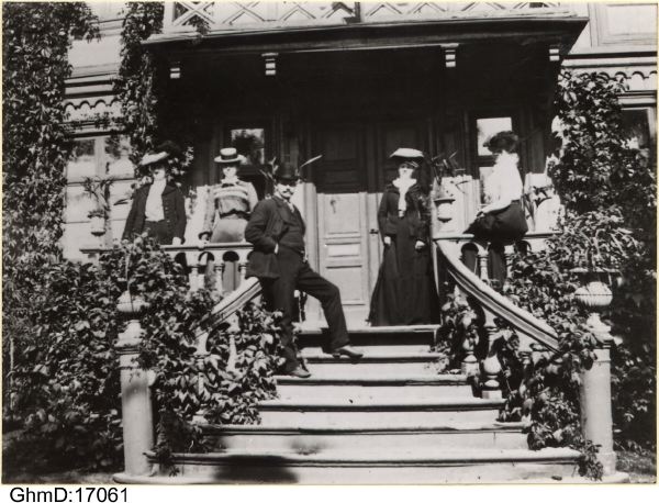 Oscarsdahl, persongrupp på entrétrappan. Troligen borgmästare Lamberg t.v.