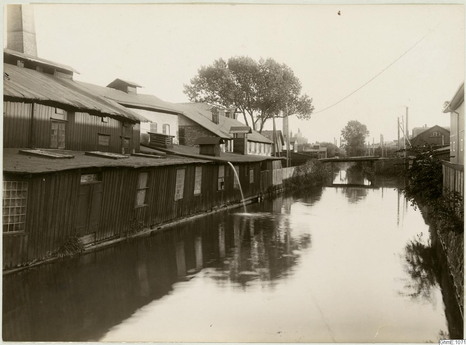 Mölndalsån, fotot taget från bron vid Getebergs led, söderut. Till vänster Bohus Mekaniska Verkstad.
