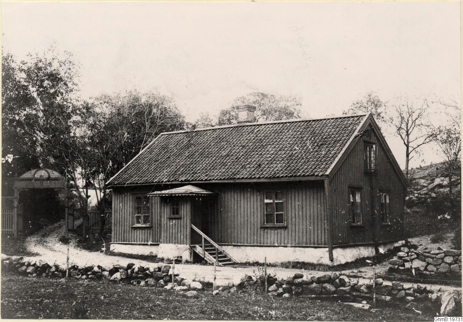 Magister Björkmans skola. Låg vid inkörsporten till Lundby prästgård under 1800-talets slut.