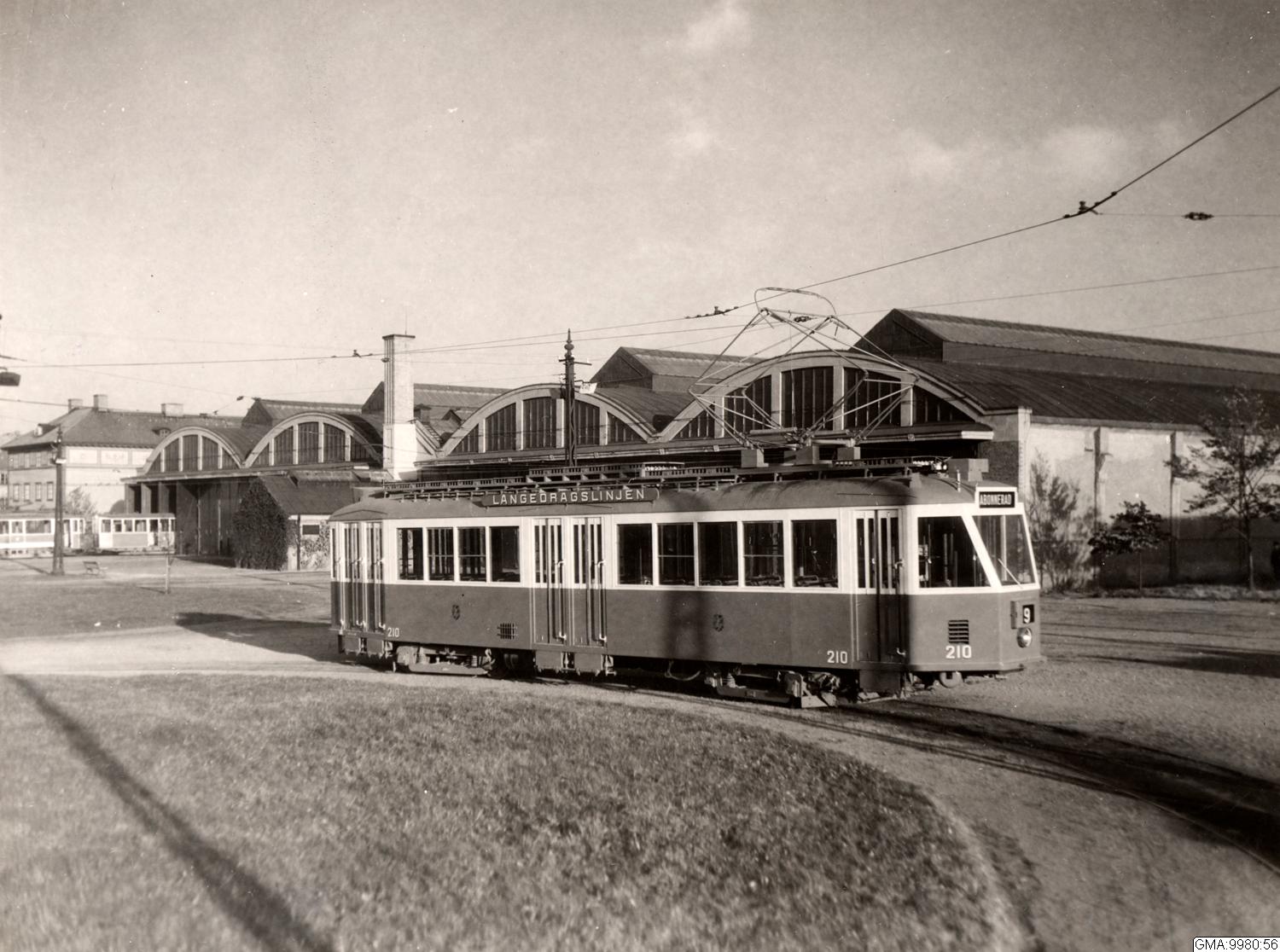 Vagnhallen Majorna vid hörnet Karl Johansgatan och Älvsborgsgatan. I fonden landhövdingehus vid Älvsborgsgatan.