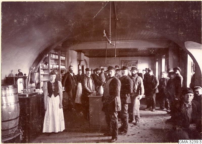 Interiörbild från "Krog" med okänd adress. Av takvalv och fönsternischer att döma kan det ev vara en utskänkningslokal innanför vallgraven.