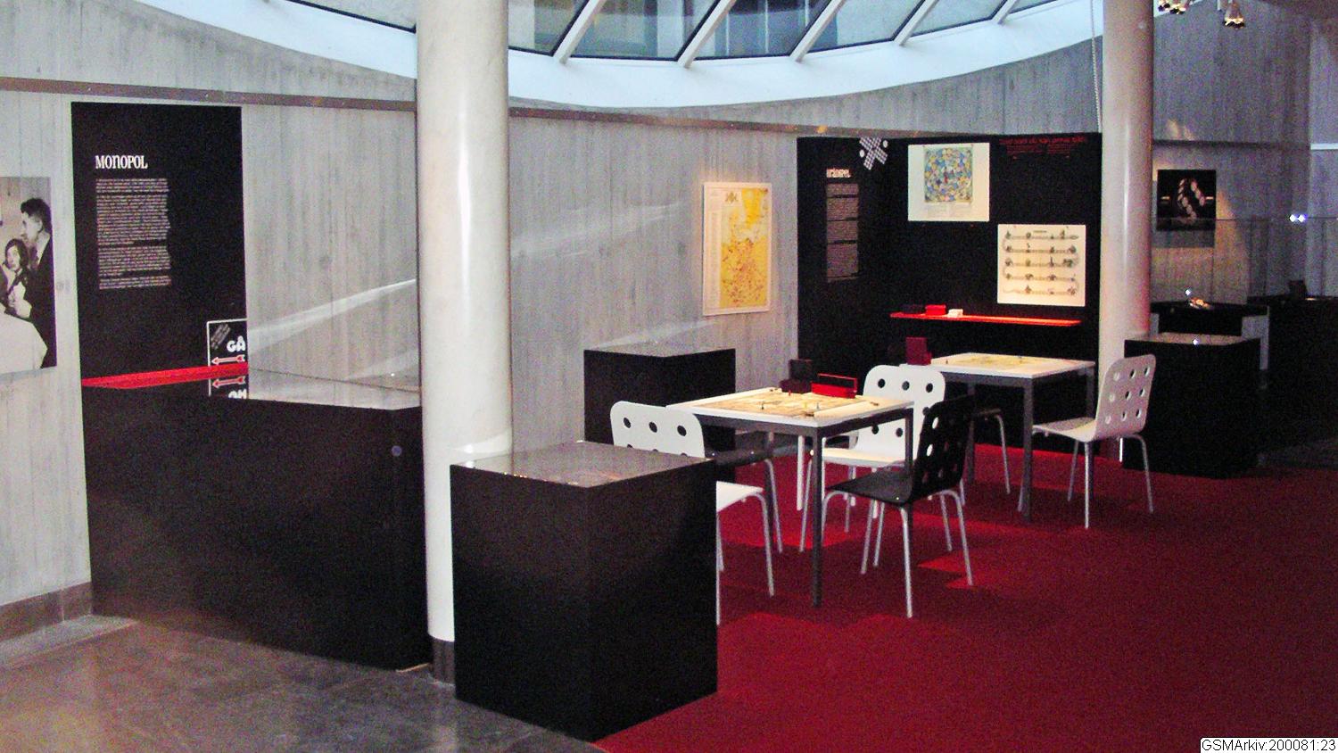På bilden syns två sittgrupper för spel. Tre montrar med olika spel och tillbehör till spel, en monter med det ursprungliga Monopolspelet.