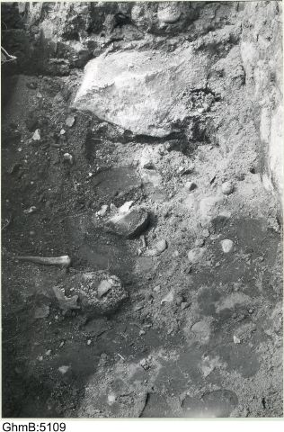 den gamla begravningsplatsen blottas vid grundgrävningsarbeterna 1932. Två kranier synliga.