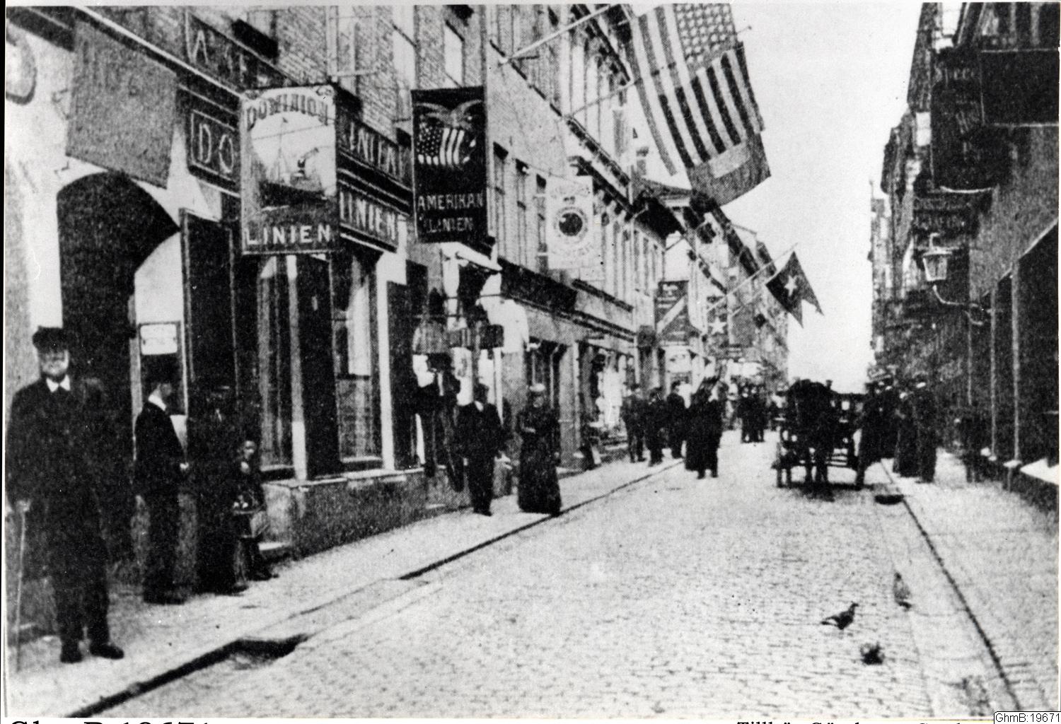 Sträckningsbild med Postgatan/Sillgatan mot väster och hamnen. Emigrantgatan omkring sekelskiftet. Emigrantkontorens flaggor vittnar om avresedag för deras passagerare.