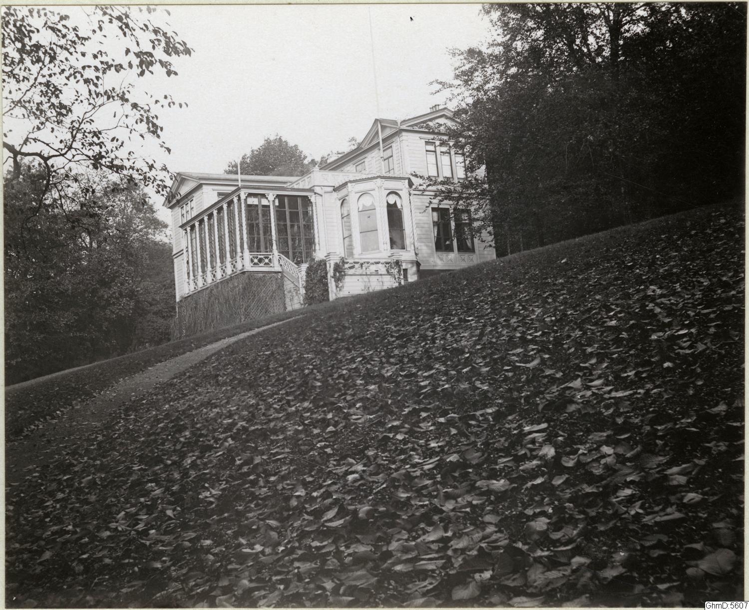 Vy med Villa Odinslunds södra gavel och verandan mot väster.