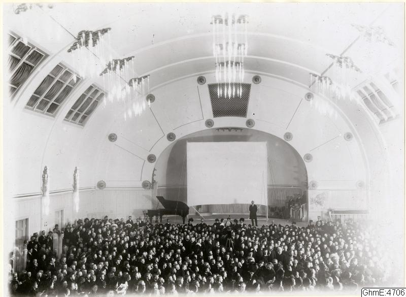 Interiörbild av Gamla Konserthuset på Heden, föreläsning med Dr Sven Hedin.