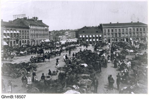 Kungstorget en fardag på 1870(?)-talet. Stora Saluhallen var färdig 1 febr. 1889.