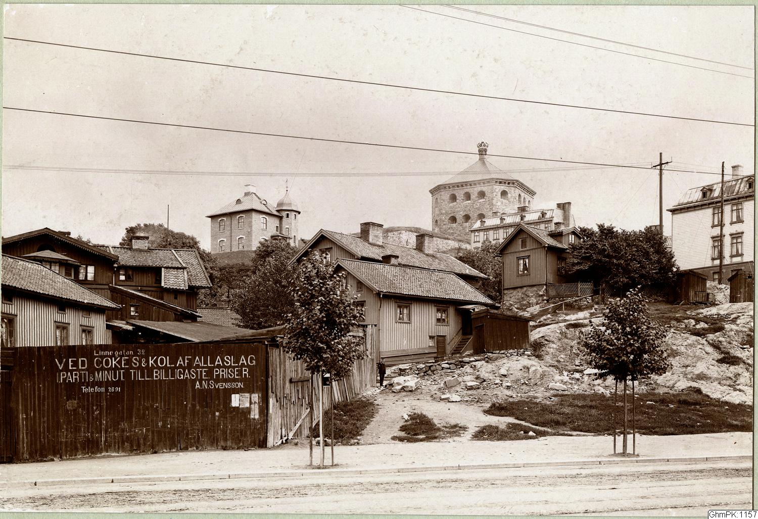 Linnégatans östra sida, nedanför Skansen kronan. Bebyggelse vid foten av Risåsen.