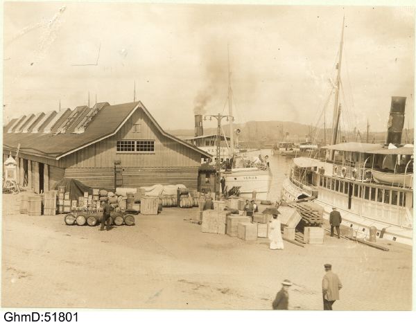 Lilla Bommens hamn mot väster. Mellan hamnmagasinet och fartygen syns Hisingen och Ramberget.