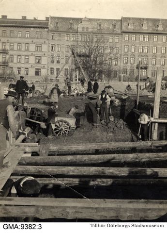 grundläggnings m.fl. arbeten på den nya Högskolan, mars-april 1905. I bakgrunden bostadshus på Götabergsgatan.