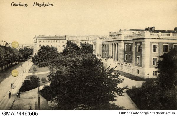 Högskolan med bostadshus på Götabergsgatan och vasagatan i bakgrunden.