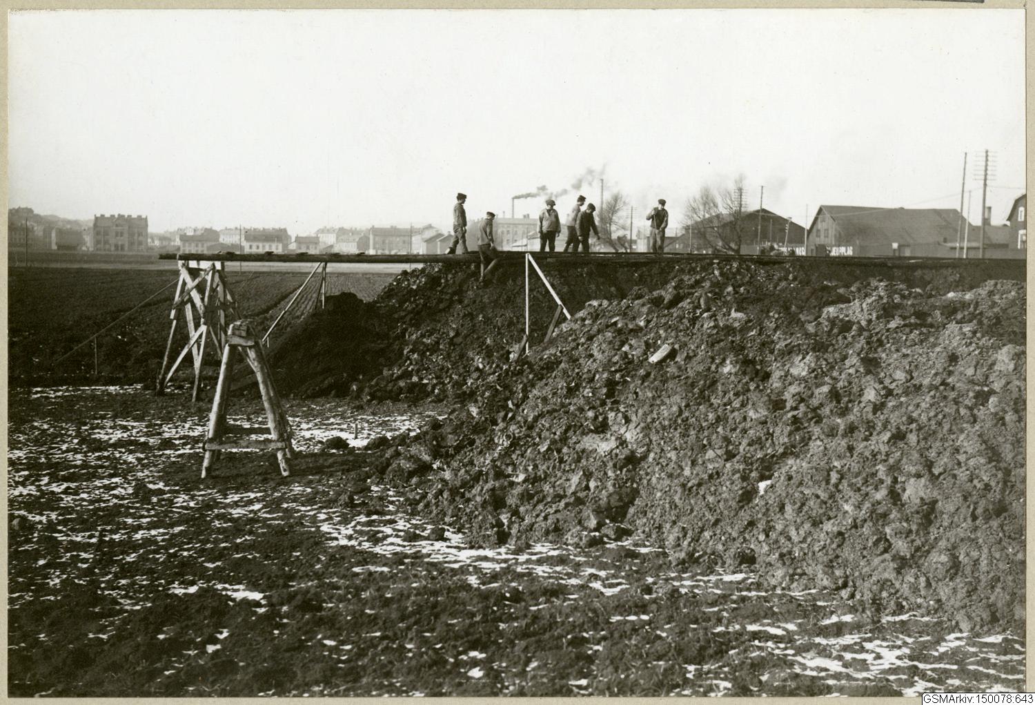 Arbetet med jordvallen vid Kvillebäcksvägen d. 1 Mars 1914.