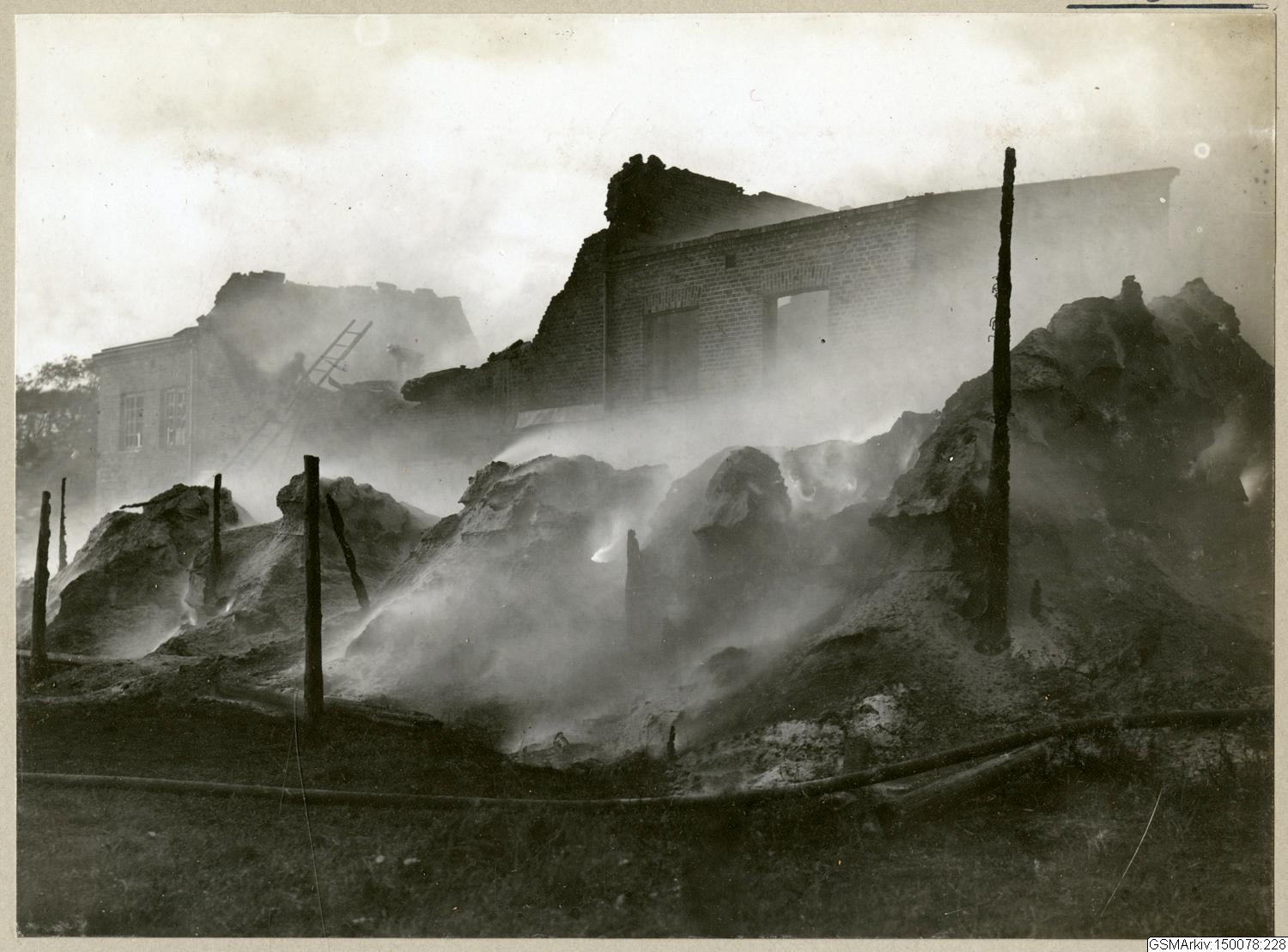 Beskrivning: Trämjölsfabriken vid Sävenäs i brand. d. 9 Aug 1913