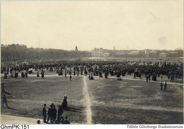 Heden sedd mot nordväst, med Dicksonska villan och Exercishuset i fonden. Bilden skulle möjligen kunna visa en demonstration från arbetarrörelsen.