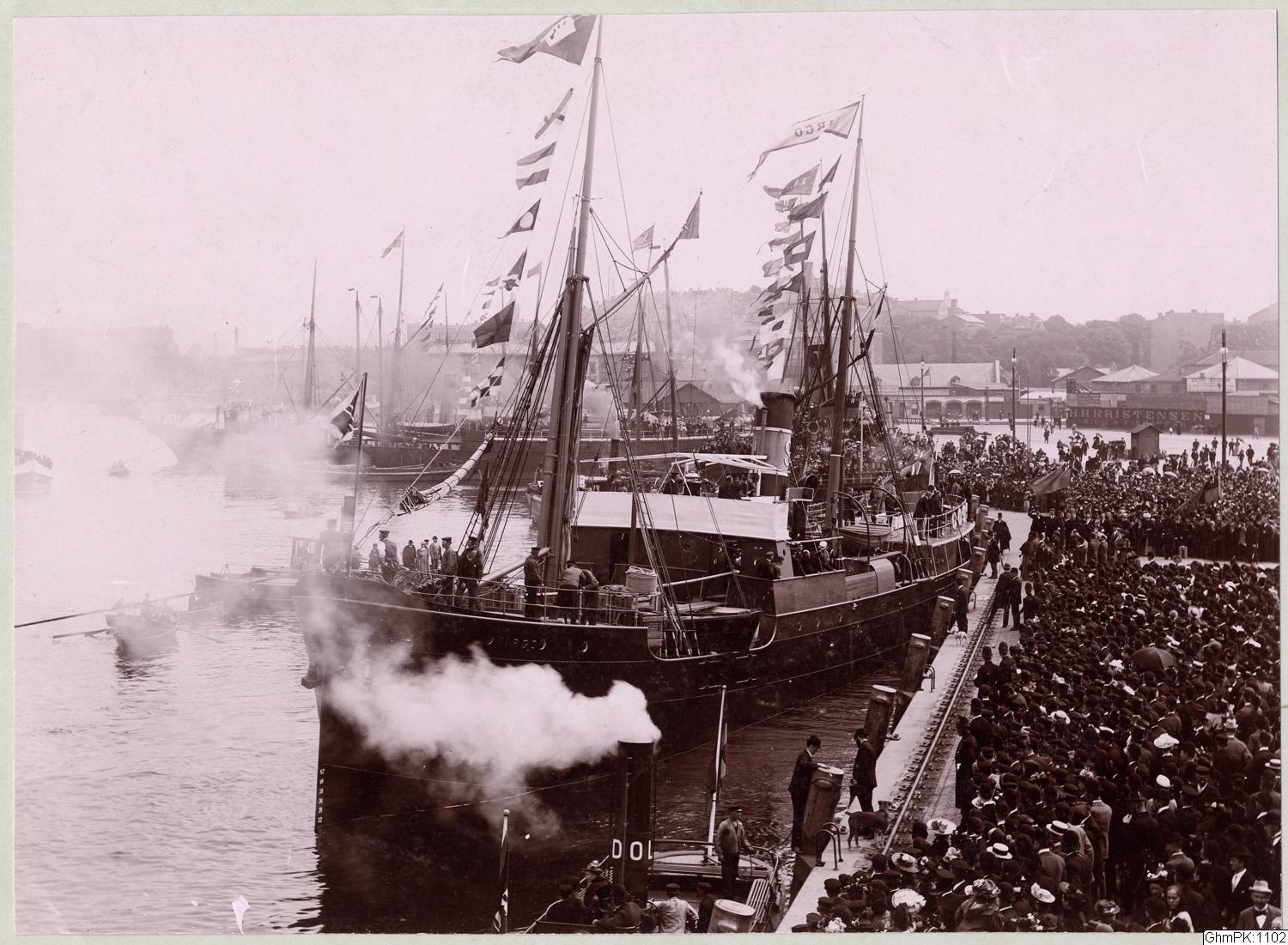 Andrées polarexpedition. Enligt arkivblad: "S. A. Andrées avfärd från Göteborg d. 7 juni 1896: ångaren "Wirgo" vid Skeppsbron."