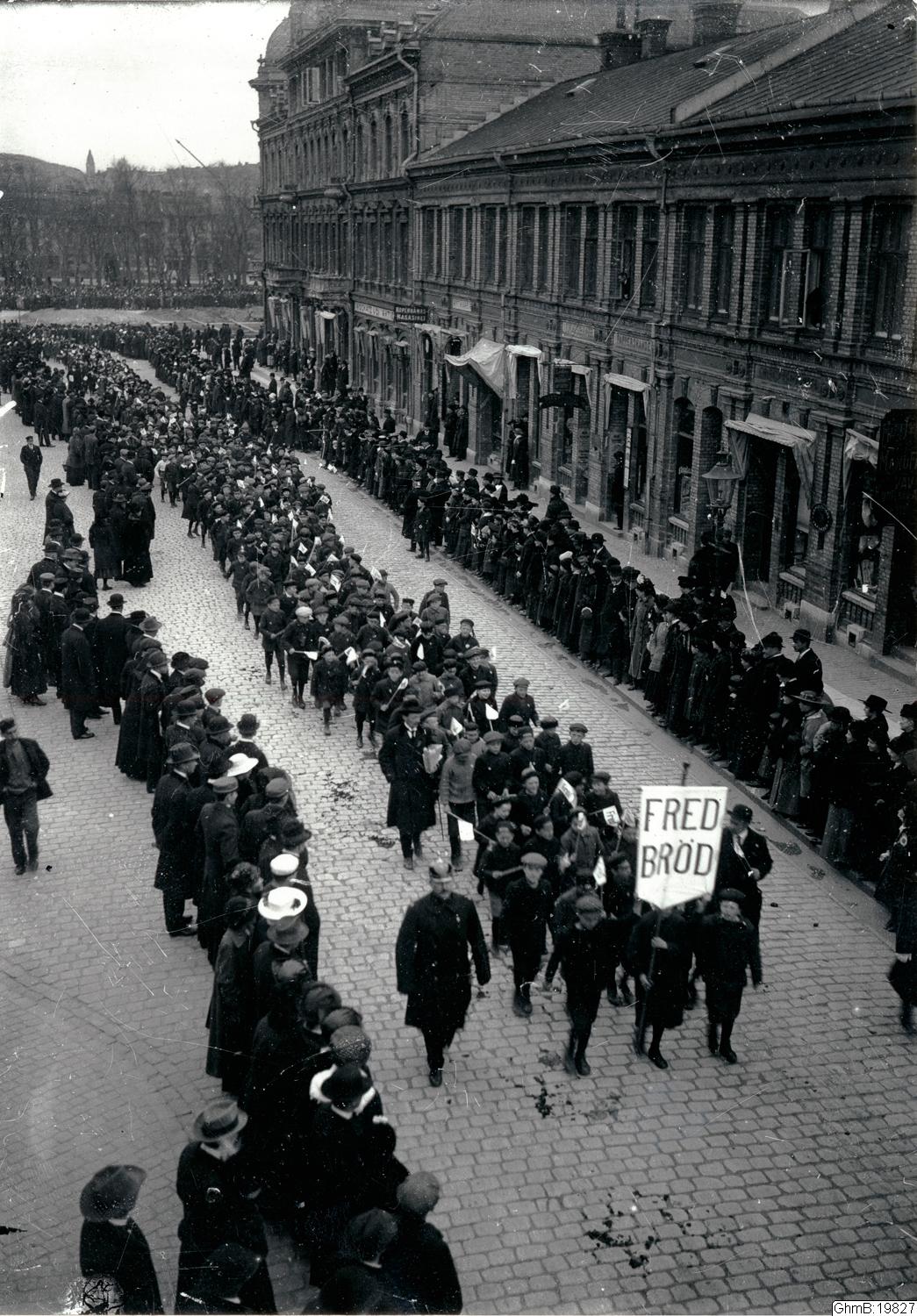 En stor skara ungdomar, med egna plakat, utgjorde förtrupp till demonstrationståget i Göteborg den 2 maj 1917. Här drar de fram över Hvitfeldtsplatsen.