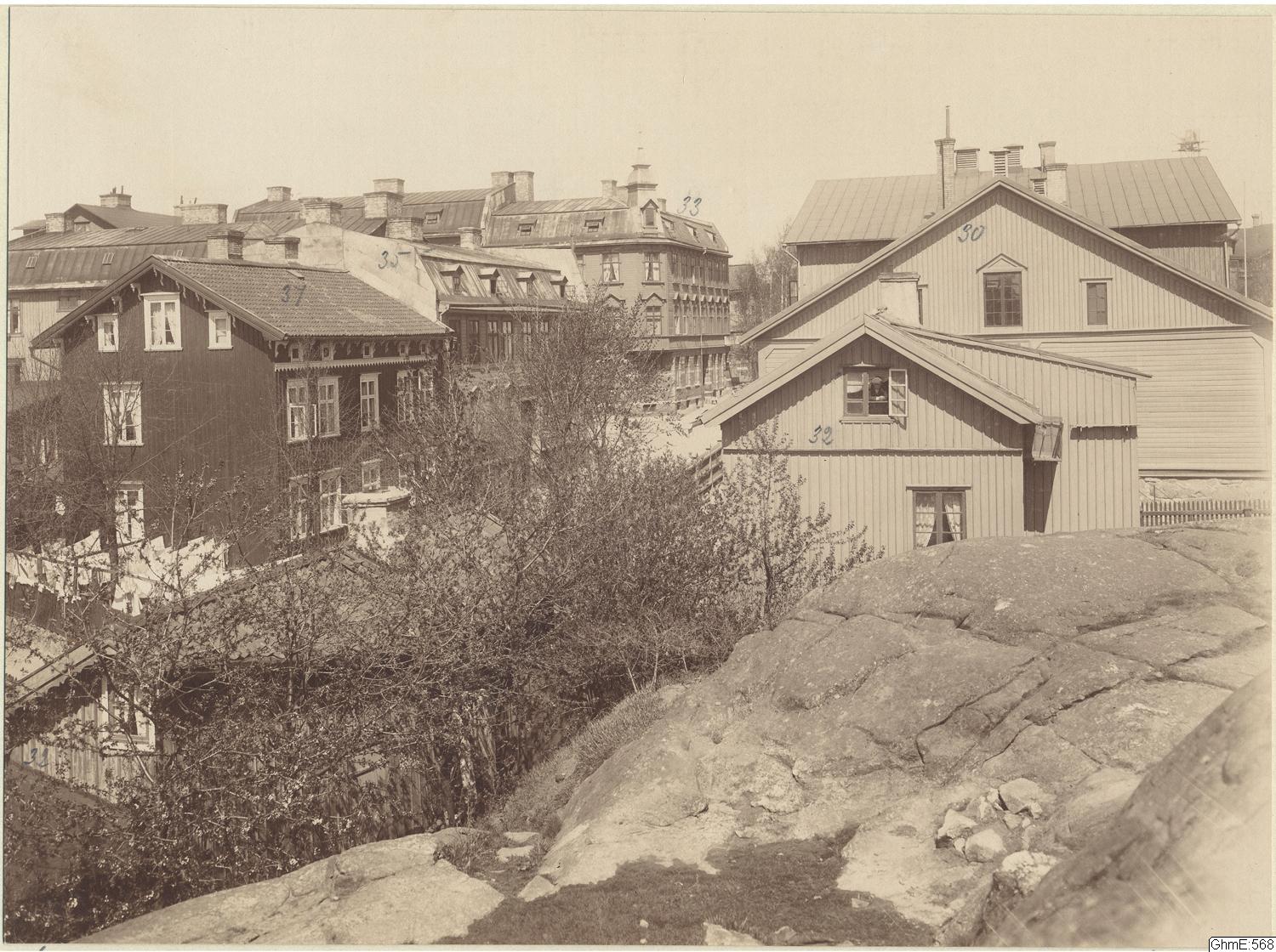 Gråbergsgatan österut, några av husen numrerade, till vänster i bild nr 37, 35 och 33. Till höger nr 32och 30.