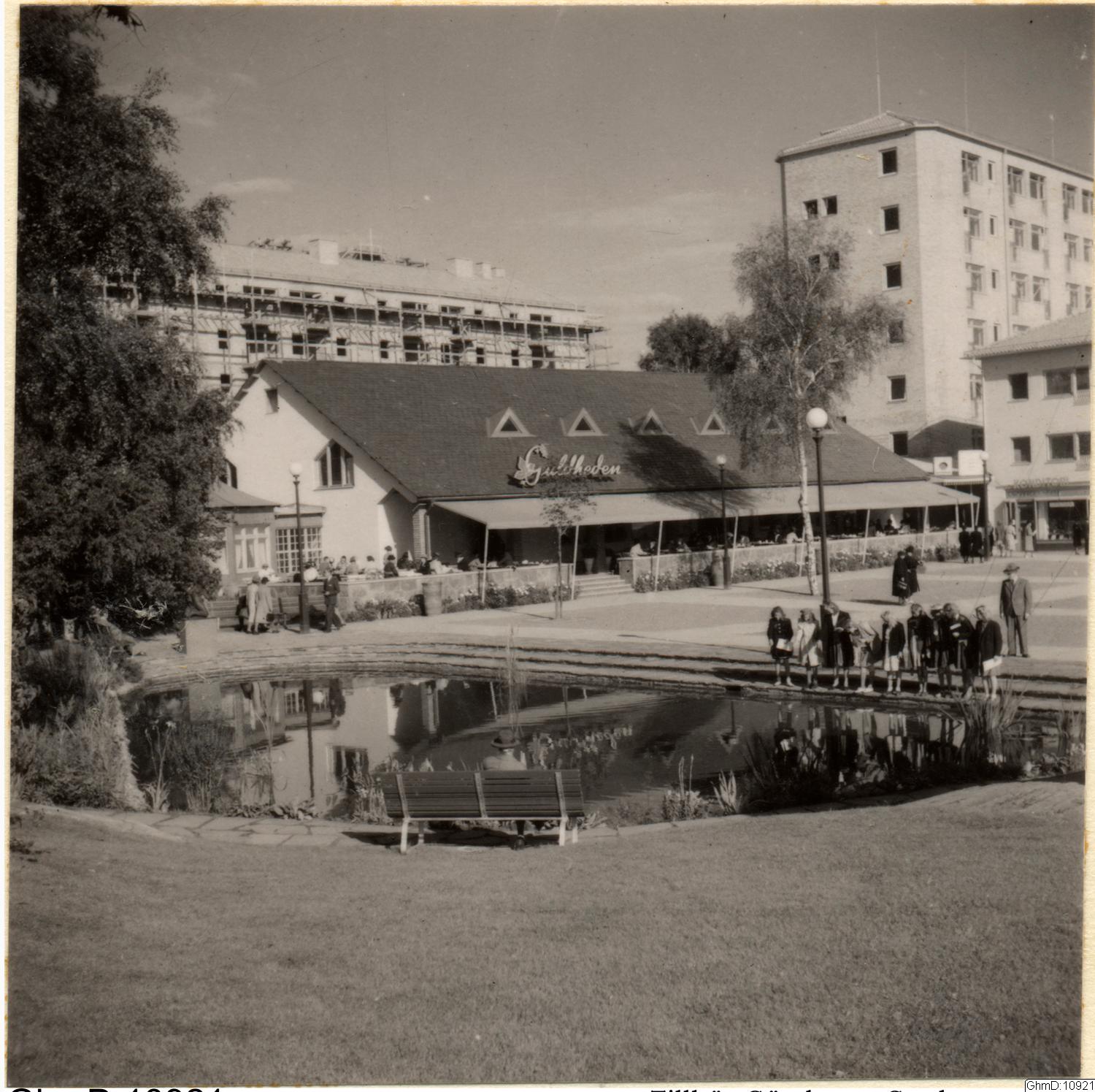 Vy från Guldhedstorget och restaurang Guldheden, med uteservering. I bakgrunden nya bostadshus.