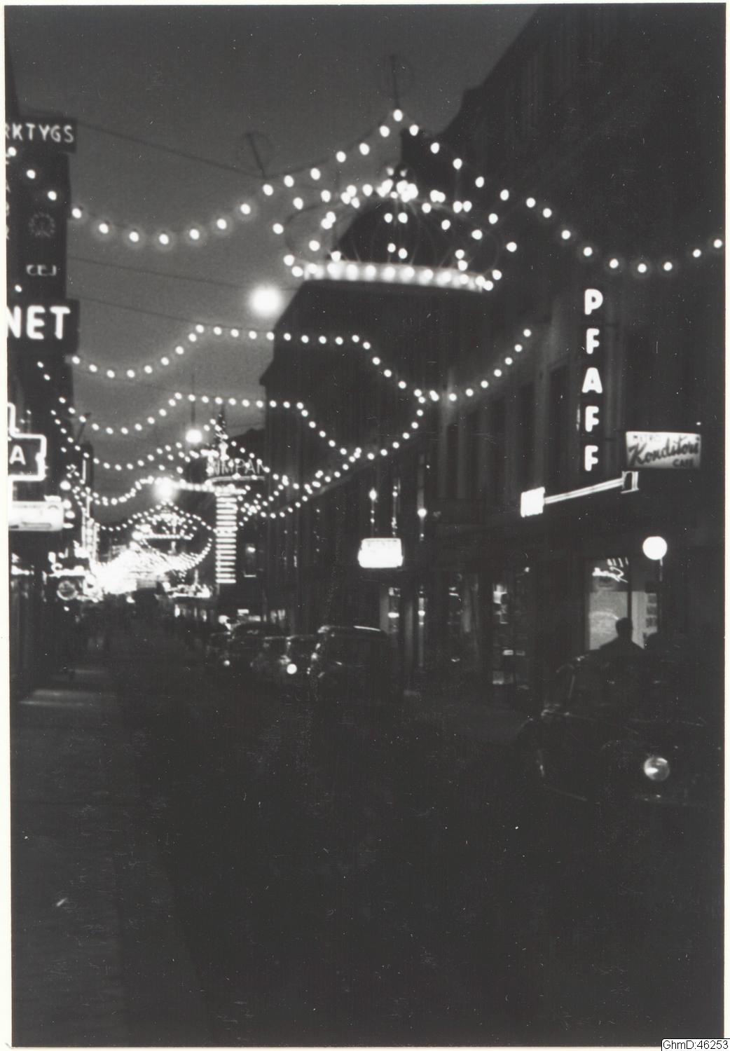 Sträckningsbild, Kungsgatan med juldekoration," ljuskronor" upphängda över gatan.