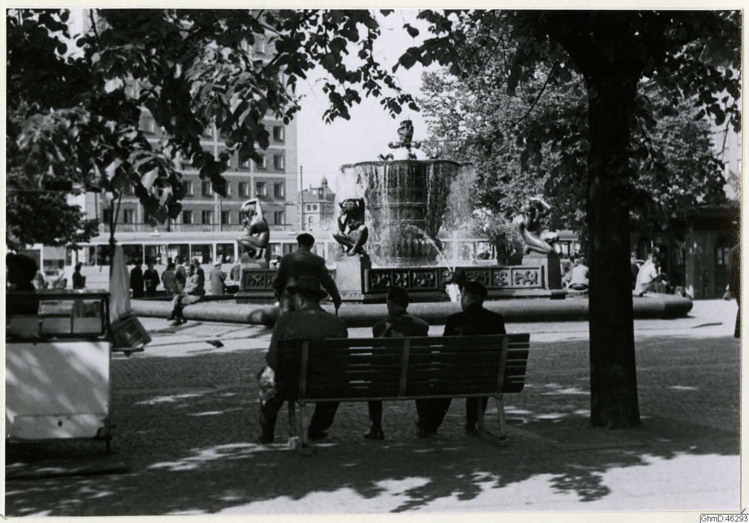 Järntorget med Järntorgsbrunnen och Folkets Hus skymtande bakom träden.