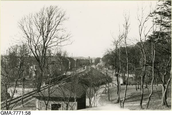 Från utkanterna av Jakobsdalsparken - en rest av egendomen Jakobsdals gamla parkanläggning. T.v.: Västkustbanan.