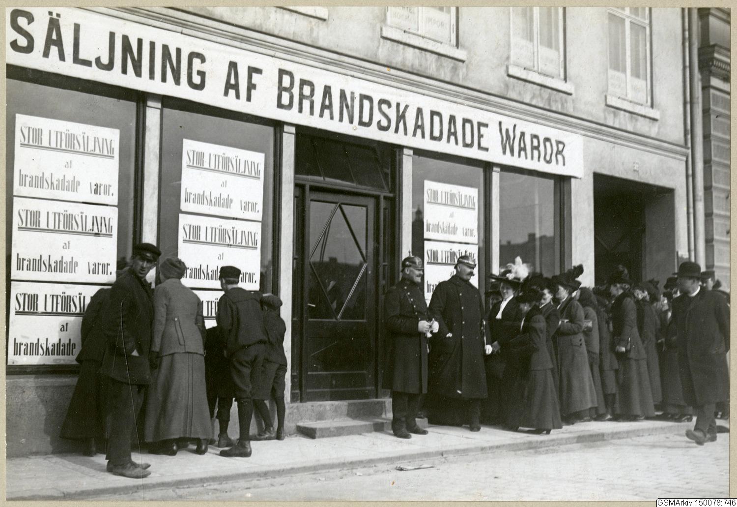 Kö utanför försäljning av brandskadade varor d. 21 April 1914