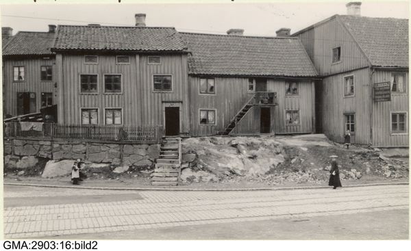 Hus mitt för Karl Johans Kyrka. Fr. h. t. v.: Majornas 1 rote, nr 156,157,158,159.