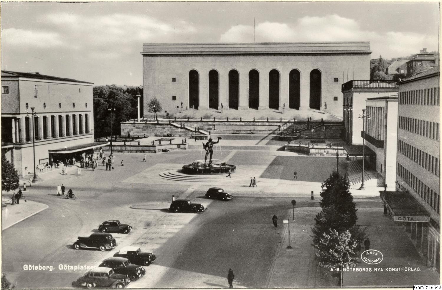 Götaplatsen från Kungsportsavenyen, mot söder. bilden visar Göteborgs stadsteater, Göteborgs konstmuseum med konsthallen, Konserthuset och biografen Göta, från vänster till höger.