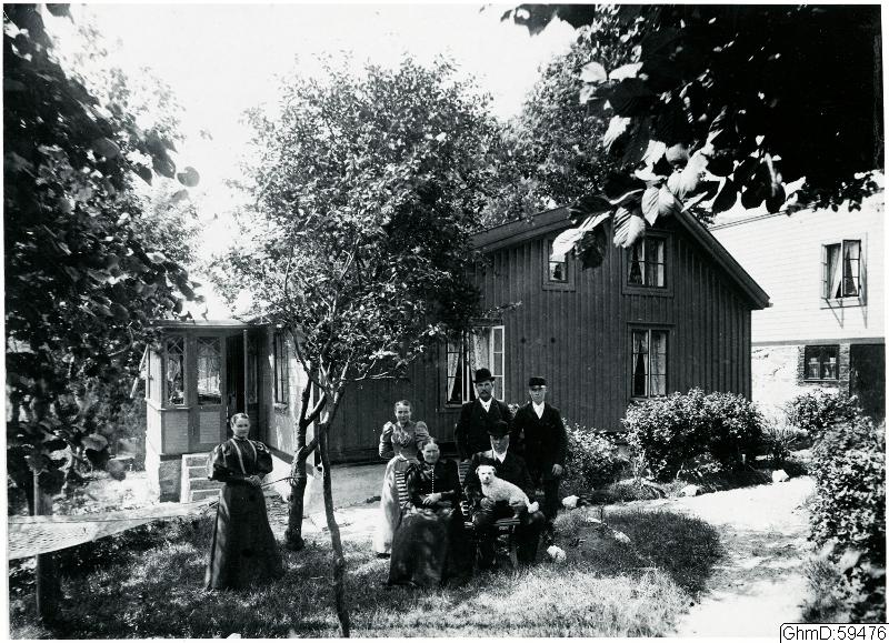 I soffan skeppare Christen Andersson med hunden i knät (född 1893) och han hustru Anna Carolina (som ogift Samuelsson, född 1848). Bakom soffan sonen, skepparen Axel Ivar Kristensson(född 1872) och Anna Sofia Kristensson, (som ogift Börjesson).