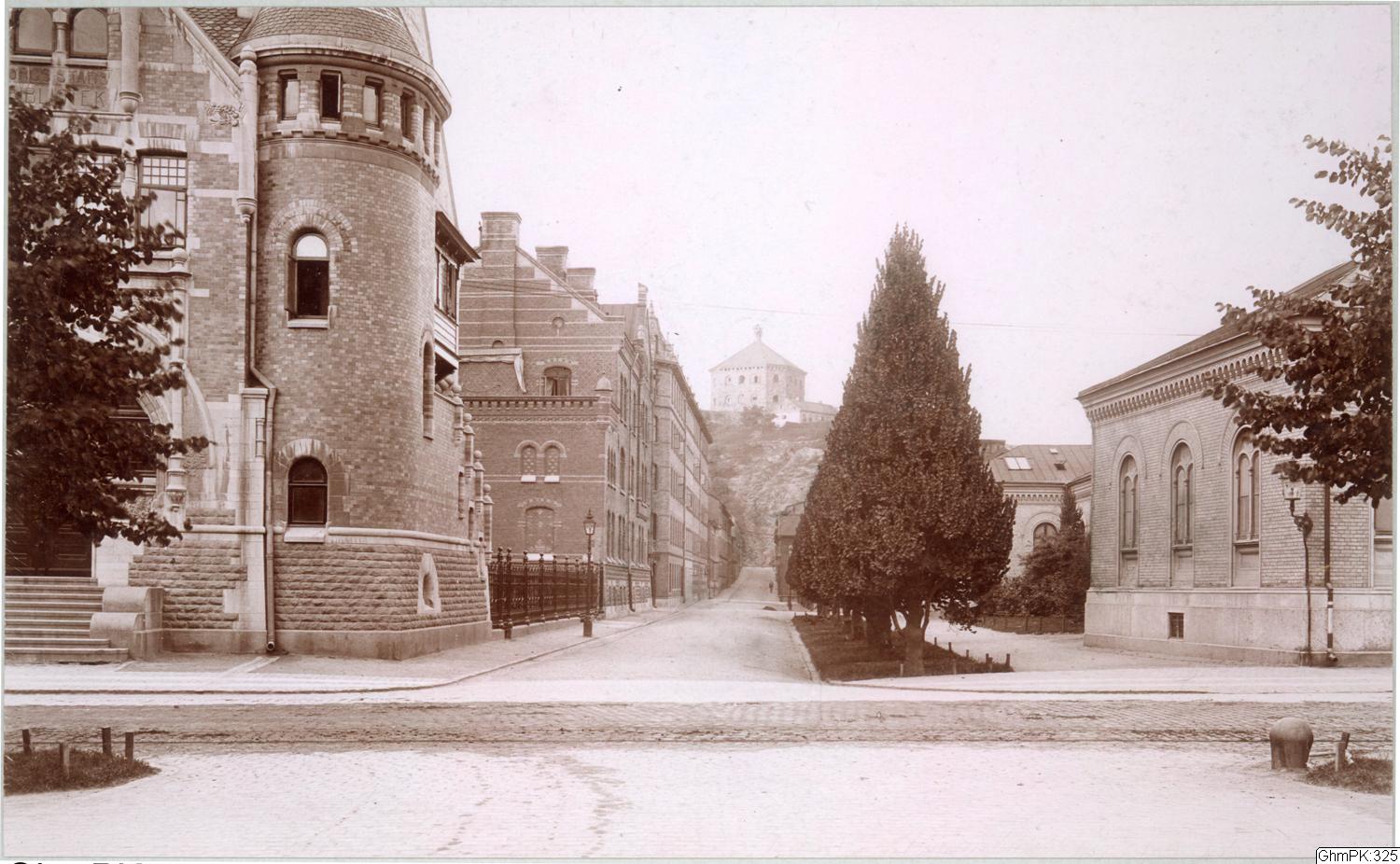 Sträckningsbild med Kaponjärgatan mot söder. I bildens framkant Dicksonska Folkbiblioteket till vänster, Renströmska badanstalten. I fonden Skansen Kronan.