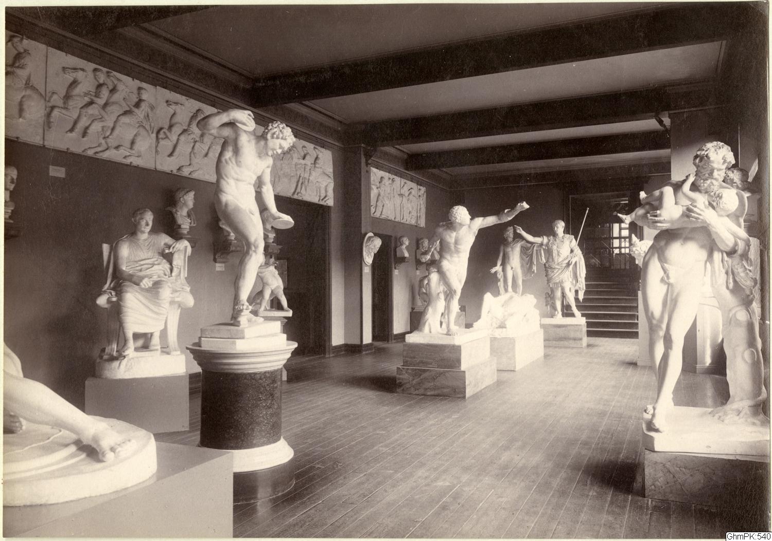 Utställningslokal med äldre skulptur, kopior efter antika förebilder, konstavdelning på Göteborgs Museum. Uppe under taket, till vänster, en kopia av en del av Parthenonfrisen från templet i Athen.