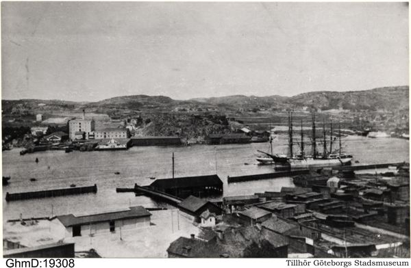 Motiv av Göteborgs hamn, slutet av 1800-talet. Taget från Karl Johans kyrka.