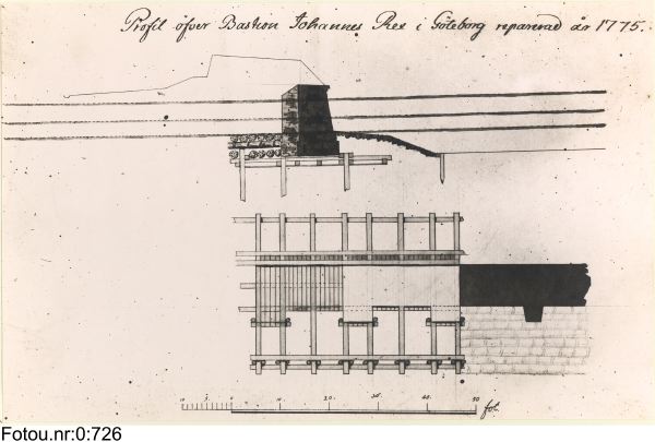 plan och profil över bastionen Johannes Rex samt den därå verkställda reparationen, upprättad år 1775 av konduktören vid Fortifikationen C. Råbergh.
