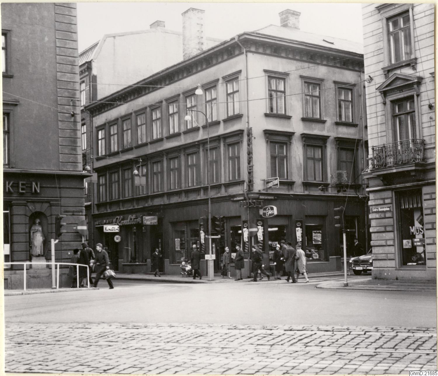 Korsningen Södra Hamngatan och Södra Larmgatan. Södra Larmgatan 59 i bildens mitt, till vänster Göta Källare.