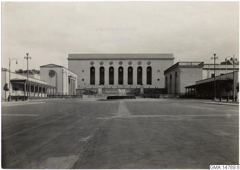 Svarvitt foto, med Konstmuseet i mitten, flankerat av Jubileumsutställningens huvudentré till vänster och Konsthallen till höger.