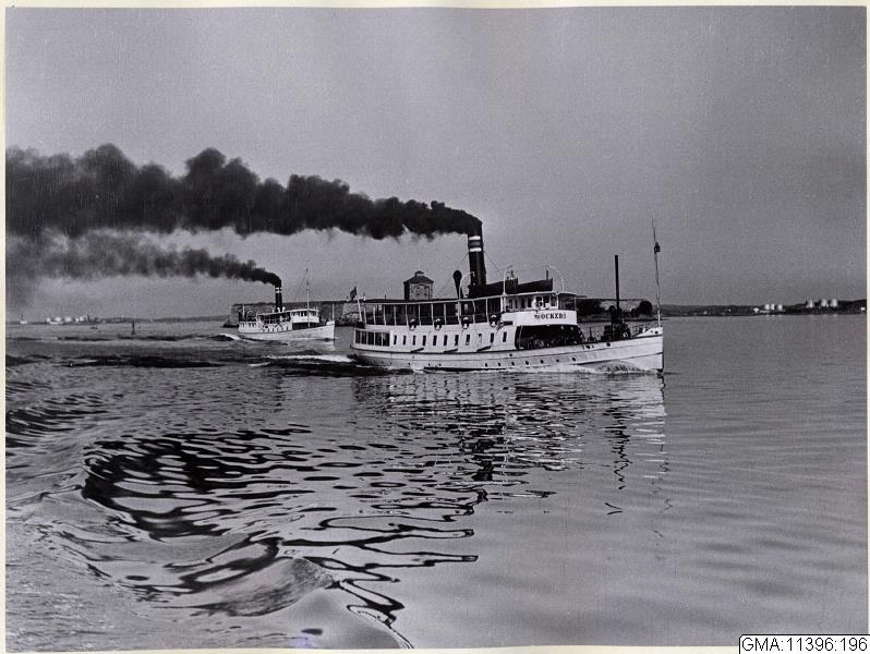 Svartvitt foto med 2 st skärgårdsbåtar på Älvsborgsfjorden på väg mot Göteborg. Bakom fartygen skymtar Fästningen Nya Älvsborg, längst till höger i bild oljehamnen.