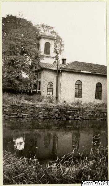 Svartvitt foto av Mariakyrkans torn med entré och en del av långhuset.