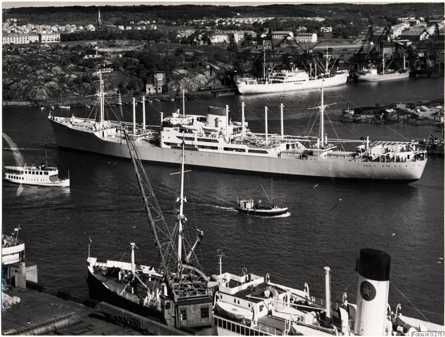 Vy av Göteborgs hamn vid Sannegårdshamnen. I fonden Sannegården och Lundby nya kyrka