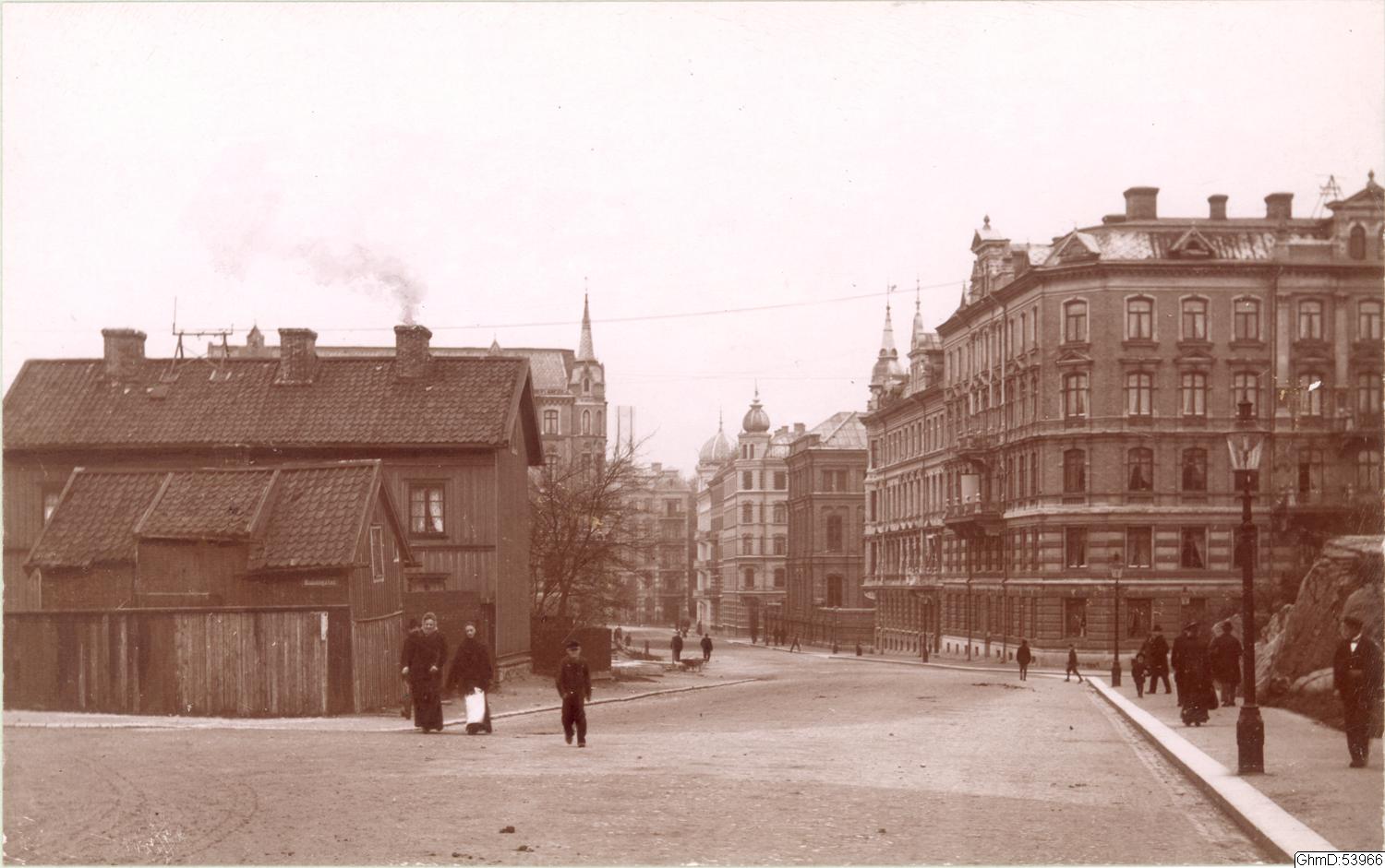 Engelbrektsgatan västerut. Trähuset till vänster på Molinsgatan ingick i bebyggelsen som hörde till Brandtdala. Husen i området revs i början på 1900-talet och gjordes om till park/grönområde