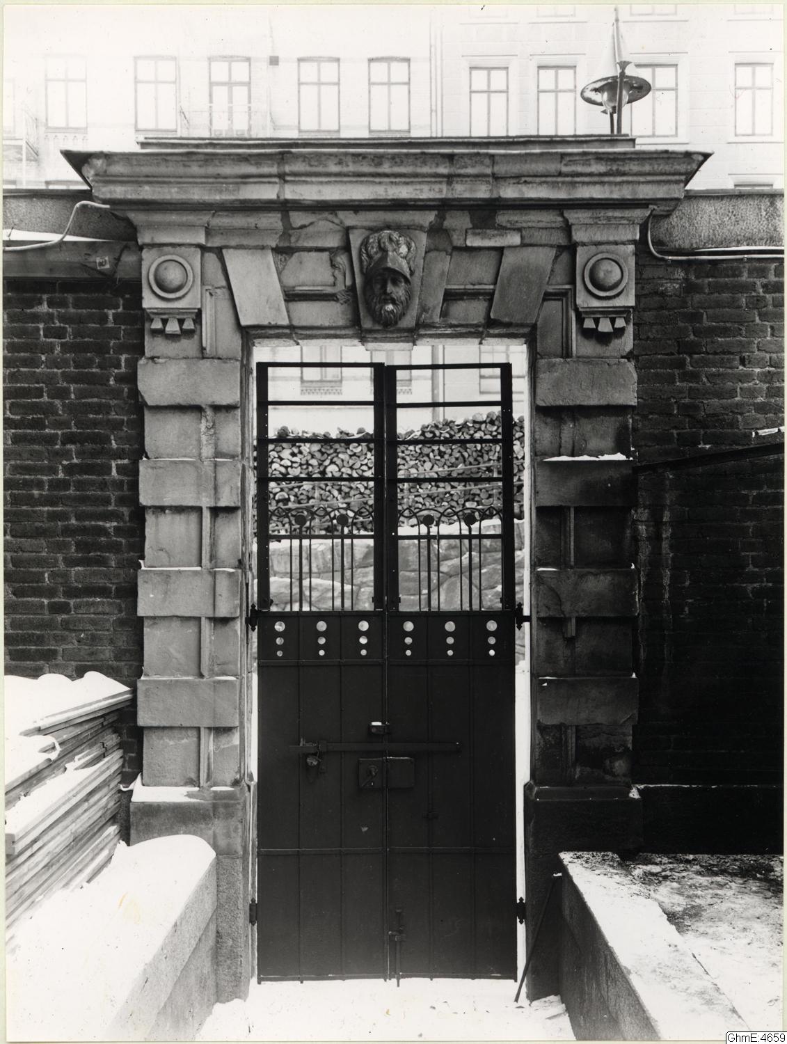 Fotot taget på gården till Telegrafverket mot Kaserngränden/Hvitfeldtsgatan. Baksida av 36 Kvarteret Telegrafverket. Framsida vänd mot Kaserntorget och Kungsgatan.