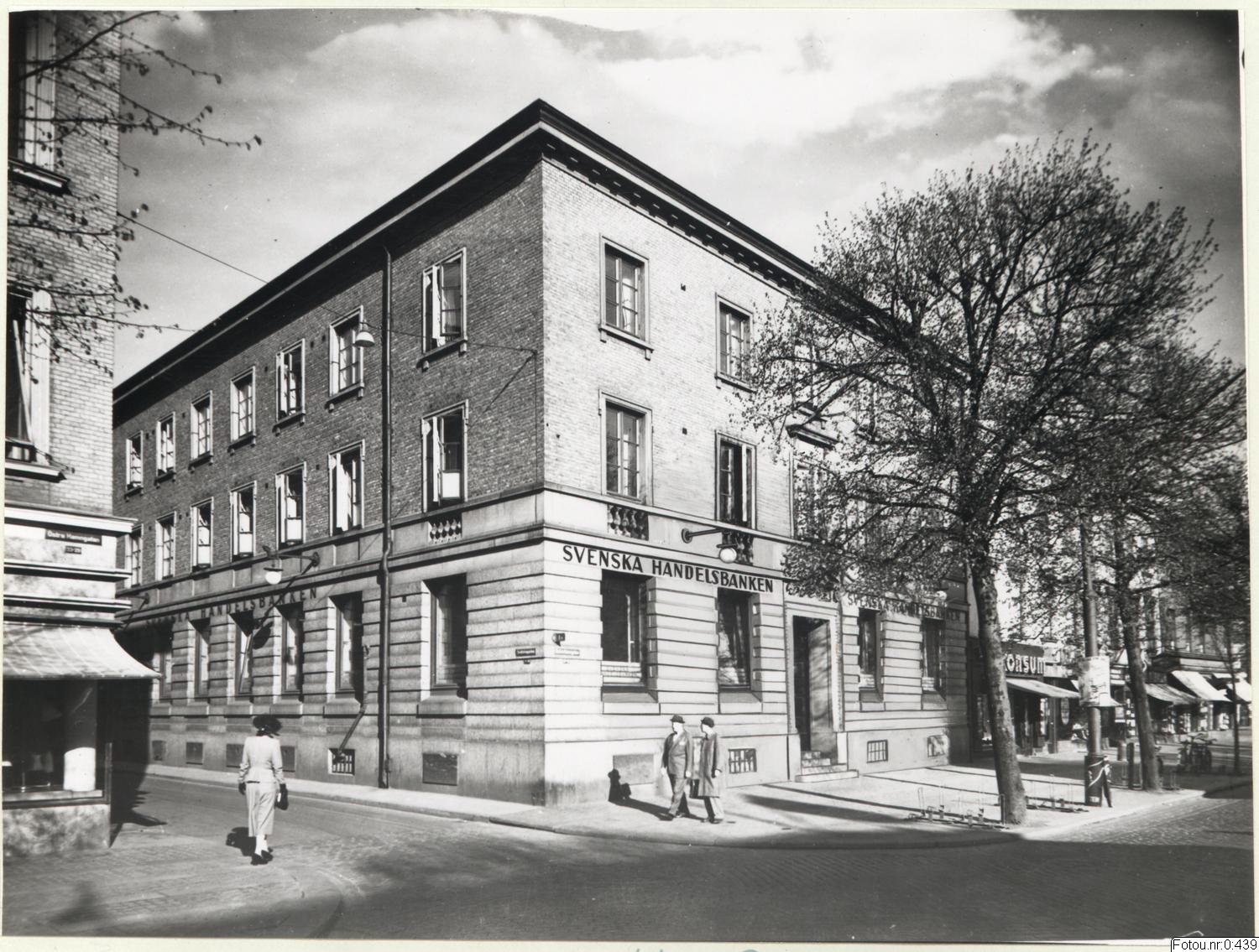Svenska Handelsbankens kontor vid Östra hamngatan 27. Drottninggatan västerut till vänster.