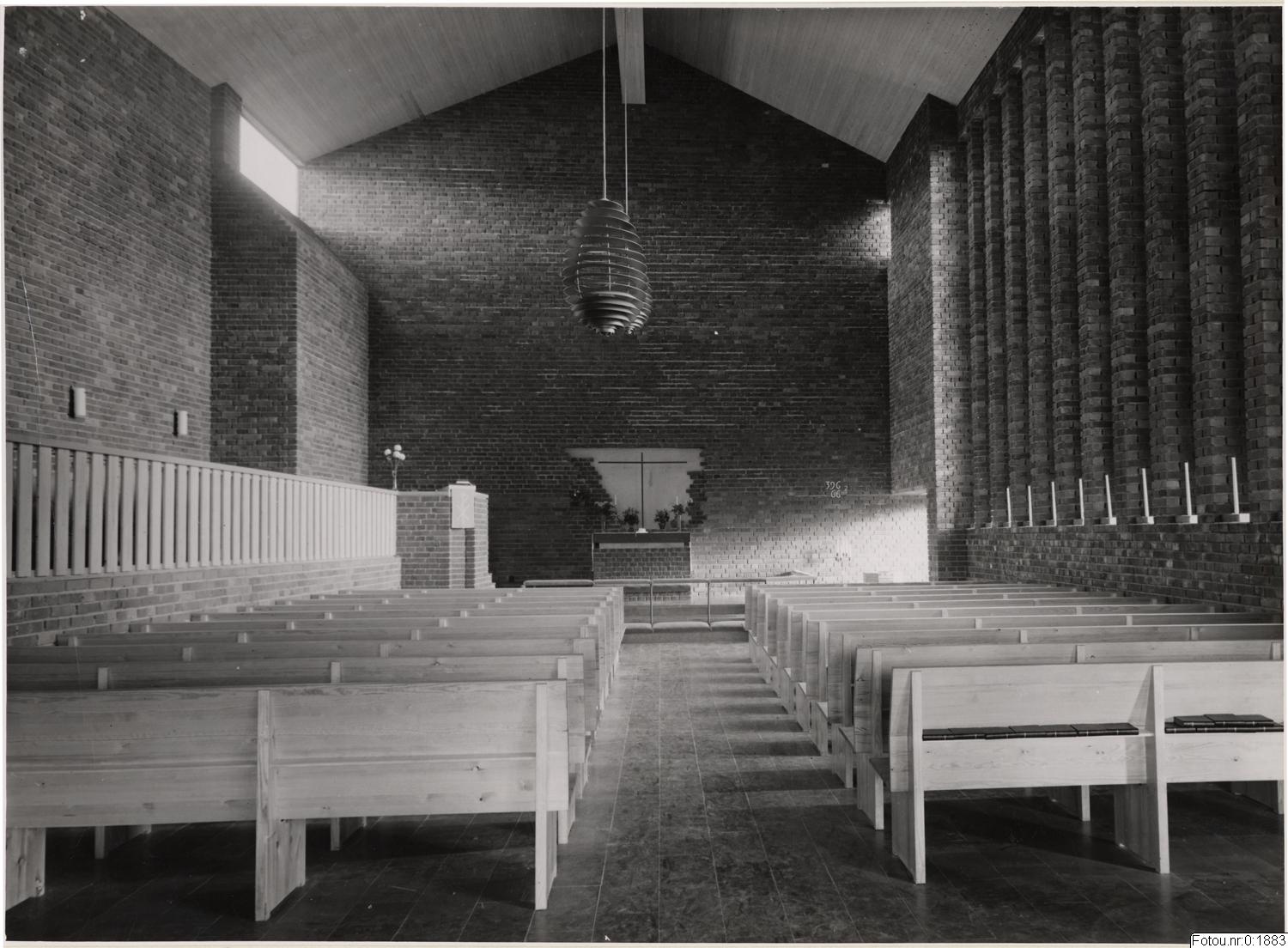 Interiörbild från Allhelgonakyrkan, Kortedala. Kyrkan och klockstapeln uppförda 1956. Invigningen av kyrkan skedde på Allhelgonadagen den 3 november 1956 av biskop Bo Giertz.