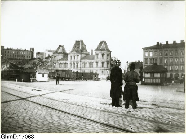 Polis och stuveriarbetare vid hamnen i samspråk på packhusplatsen.