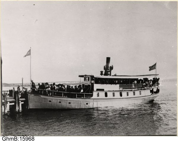 Ångbåten Arendal vid Villabron. Troligen omkring 1910. I bakgrunden mudderledning från mudderverket (en fast anläggning).