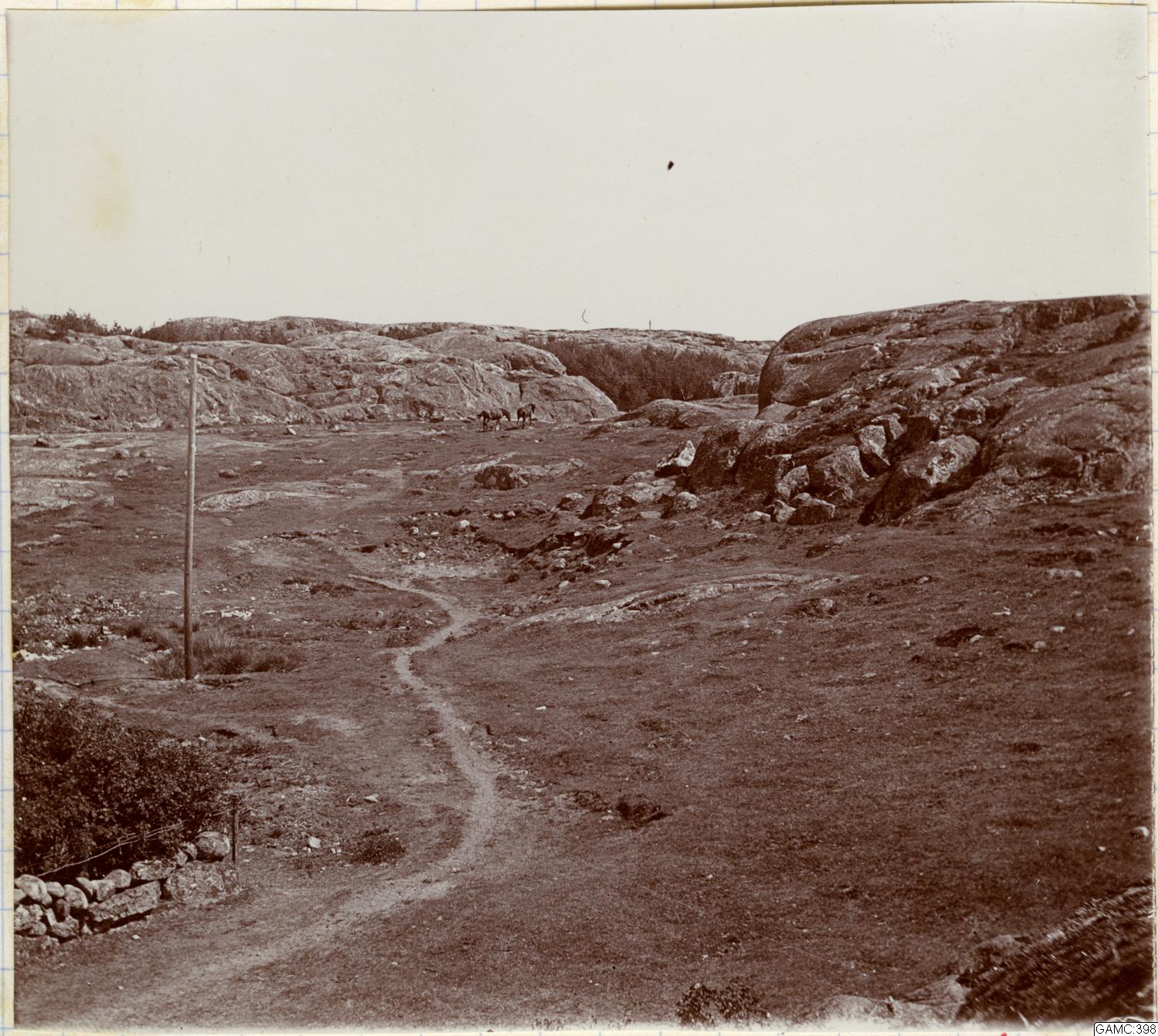 Styrsö, dalen med stenåldersboplatsen söder om prästgården. I hörnet nere till vänster syns muren till prästgårdens trädgård. I en grusgop belägen där hästarna går, hittades ett ämne till grönstensyxa, Lithultsyxa. Flintspån fanns över hela delen av sluttningen.
